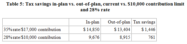The following table compares the tax benefit (currently available) with respect to a maximum $17,000 contribution vs. the tax benefit if the 401(k) contribution limit were reduced to $10,000; we assume no change in the current 35% highest marginal tax rate.