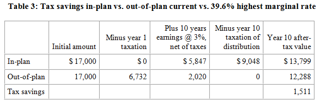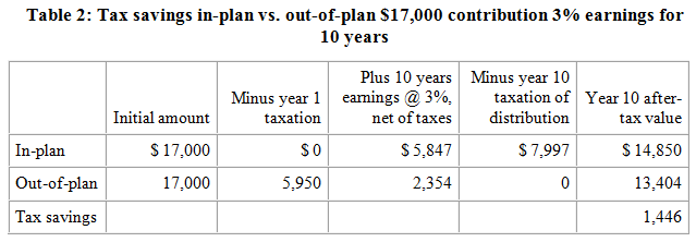 If she didn’t contribute to the plan, how much would she have? After paying taxes in year 1, the $17,000 is reduced to $11,050. If the taxpayer invests that amount in taxable investments paying an annual (before tax) return of 3%, then in year 10 she will have $13,404.