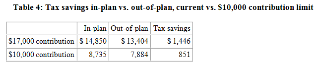 Thus the difference in value between in-plan savings and out-of-plan savings, in year 10, is $14,850 – $13,404 = $1,446. In year 10 the taxpayer will have $1,446 more if she saves in the plan than if she saves outside the plan.