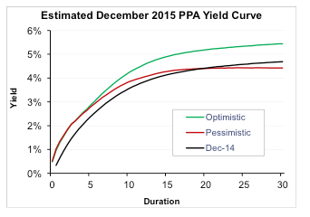 Of course, for accounting what matters is the change in rates from the last measurement date, e.g., December 31, 2015 vs. December 31, 2014. The chart below presents the same 2015 yield curve changes relative to rates for December 2014.