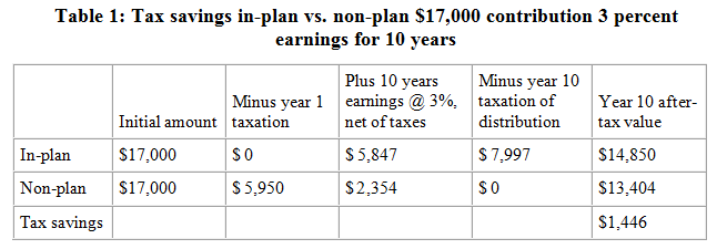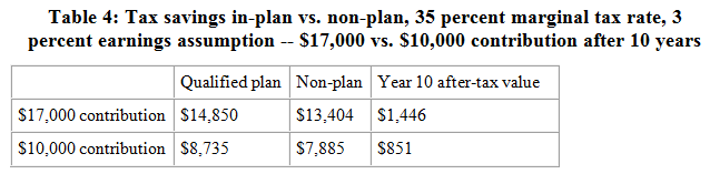 If she didn’t contribute to the plan, but saved the money outside the plan, how much would she have? After paying taxes in year 1, the $17,000 is reduced to $11,050. If the taxpayer invests that amount in taxable investments paying a (before tax) return of 3%, with annual distributions to cover taxes owed on earnings, then in year 10 she will have $13,404.