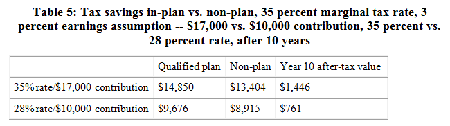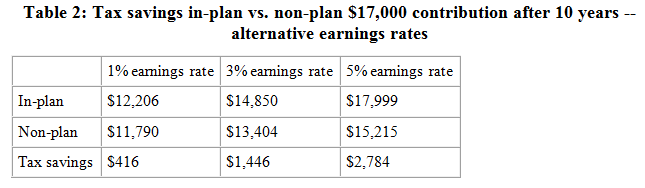 Thus the difference in value between in-plan savings and non-plan savings, in year 10, is $14,850 – $13,404 = $1,446. In year 10 the taxpayer will have $1,446 more if she saves in the plan than if she saves outside the plan.