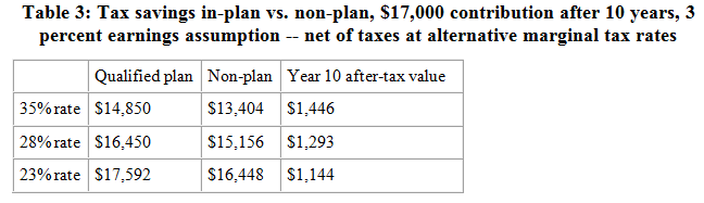 Let’s be clear about what we’ve been doing. We’ve been looking at one year’s tax benefit under different alternatives. The current benefit for a $17,000 contribution — at 3% interest and if it is left in the plan for 10 years — is worth $1,446 at the end of that period. Under current rules, every year that a highest marginal rate taxpayer makes that $17,000 contribution to a qualified plan (and leaves it there for 10 years), he gets the benefits we’ve discussed.