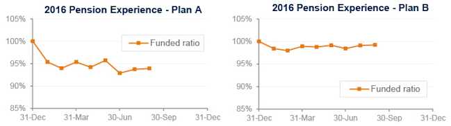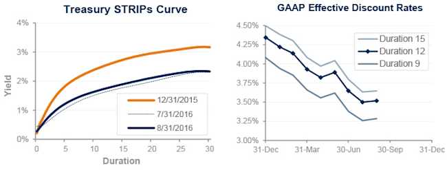 Pension liabilities (for funding, accounting, and de-risking purposes) are now driven by market interest rates. The graph on the left compares Treasury STRIPs yields at December 31, 2015 and August 31, 2016, and also shows the movement in rates last month. The graph on the right shows our estimate of movements in effective GAAP discount rates for pension obligations of various duration during 2016: