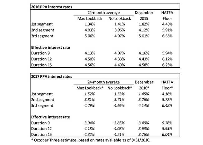 The table below summarizes rates that plan sponsors are required to use for IRS funding purposes for 2016, along with estimates for 2017. Pre-relief, both 24-month averages and December ‘spot’ rates, which are still required for some calculations, such as PBGC premiums, are also included.