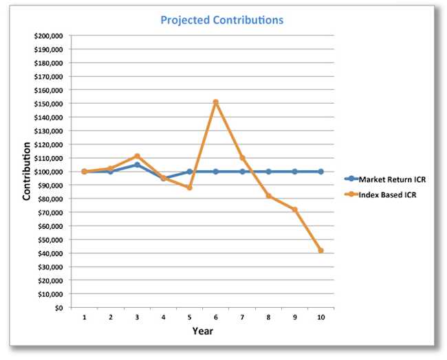 Consider the following illustrations, which compare hypothetical annual contribution requirements and projected accumulations over a 10–year period. These accumulations are under two plans that are identical except for the Interest Crediting Rate. In this example, the Index is the 30–year treasury rate (a common choice among non-market based cash balance plan design) and the actual returns are based on historical data reflecting a hypothetical portfolio (invested 80% in fixed income and 20% in equities). All yield data is from 2002 to 2012, only in reverse, with the bond portfolio returns calculated to reflect the change in rates from 2011.