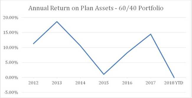 The plan asset story points more clearly in one direction – towards improved plan funding via asset returns. The following chart shows annual returns on a 60/40 portfolio for the period 2012 to date.