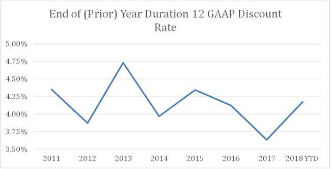 The main factor affecting liability values is interest rates. Here is a chart showing the end of (prior) year effective GAAP discount rate for a duration 12 plan for the period 2012 (as of December 2011) to date.