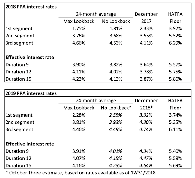 The table below summarizes rates that plan sponsors are required to use for IRS funding purposes for 2018, along with estimates for 2019. Pre-relief, both 24-month averages and December ‘spot’ rates, which are still required for some calculations, such as PBGC premiums, are also included.
