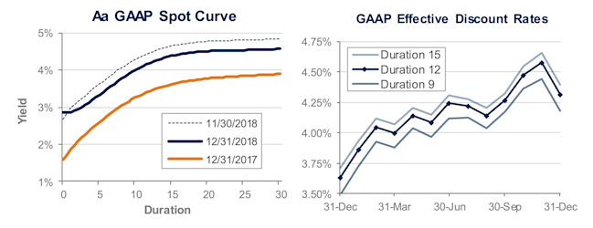 Pension liabilities (for funding, accounting, and de-risking purposes) are now driven by market interest rates. The graph on the left compares our Aa GAAP spot yield curve at December 31, 2017, and December 31, 2018, and it also shows the movement in the curve last month. The graph on the right shows our estimate of movements in effective GAAP discount rates for pension obligations of various duration during 2018: