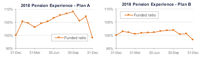 December was the worst month for pensions in a decade, due to plunging stock markets and lower interest rates. Both model plans we track[1] gave back all 2018 gains to date and then some – Plan A lost 8% last month, ending 2018 down 1%, while the more conservative Plan B lost more than 2% in December, ending 2018 down almost 2%.