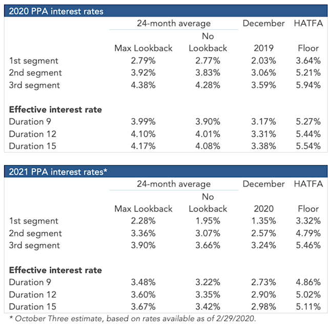 The table below summarizes rates that plan sponsors are required to use for IRS funding purposes for 2020, along with estimates for 2021. Pre-relief, both 24-month averages and December ‘spot’ rates, which are still required for some calculations, such as PBGC premiums, are also included.