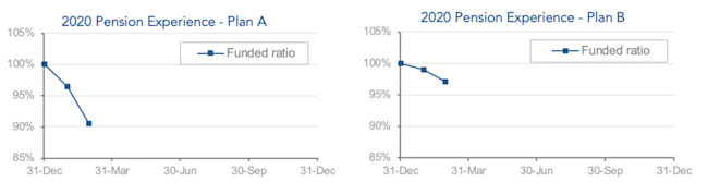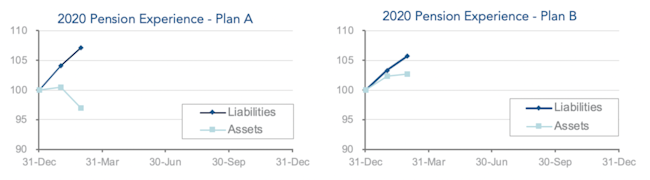 Falling stock markets grab the headlines, but unprecedented low interest rates are at least as significant a story. For pension sponsors, the combination is a real gut check. The graphs below show the movement of assets and liabilities during the first two months of 2020: