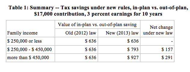 Under these rule changes, the relative value of saving in the plan increases from $636 to $927, an increase of 46%. Thus, post-fiscal cliff, saving in the plan is (relatively) a better deal for taxpayers in the new “top bracket.”