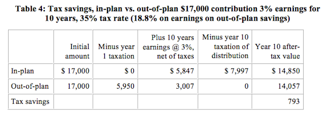 We assume that the participant invests out-of-plan savings in capital gains-generating investments and that the full amount of capital gains is taxed each year at the (lower) capital gains rate (under current rules, you would get the same result if you invested in dividend producing stocks). (A “buy and hold” capital gains strategy — where no capital gains were realized until the end of the 10 year period — would produce a slightly better tax result for the out-of-plan saver.)