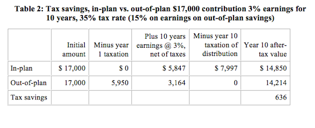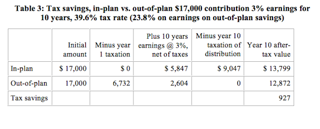 Thus, under old law rules, and assuming that out-of-plan investments maximize capital gains treatment, the participant would be $636 better off if she saved through the plan rather than outside the plan. This is also the result under the new law, in 2013, for families making $250,000 or less (assuming they are paying the top rate applicable to families below that income threshold, 35%.)