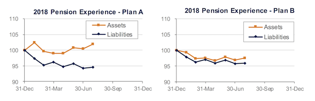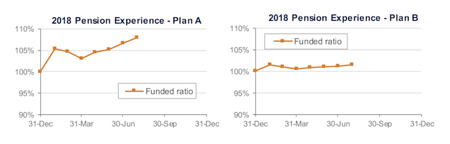 Higher interest rates (corporate yields up 0.60% so far this year) and positive stock market returns have combined to produce steady improvement in pension finances so far during 2018.