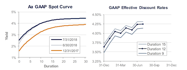 Pension liabilities (for funding, accounting, and de-risking purposes) are now driven by market interest rates. The graph on the left compares our Aa GAAP spot yield curve at December 31, 2017, and July 31, 2018, and it also shows the (tiny) movement in the curve last month. The graph on the right shows our estimate of movements in effective GAAP discount rates for pension obligations of various duration during 2018: