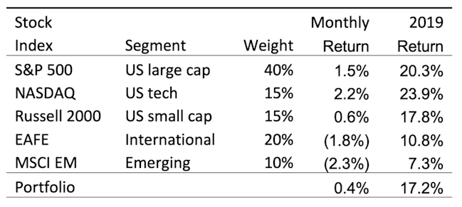 Overall, our traditional 60/40 portfolio gained less than 1% in July and is now up 13% so far this year, while the conservative 20/80 portfolio also gained less than 1% last month and is up 11% during 2019.