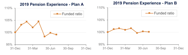 Pension finances dipped slightly in July as long-term corporate bond yields hit record lows. Both model plans we track[1] lost a fraction of 1% last month and are basically treading water (Plan A down 1%, Plan B flat) through the first seven months of 2019:
