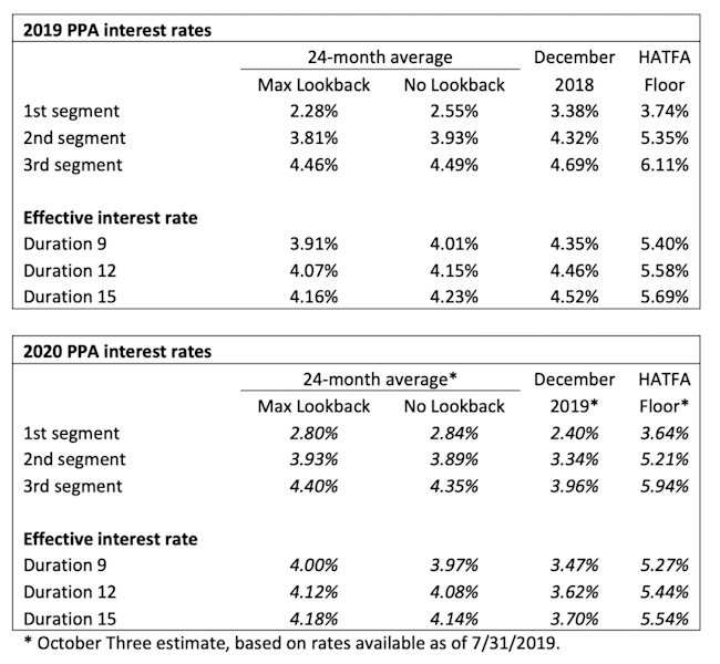 The table below summarizes rates that plan sponsors are required to use for IRS funding purposes for 2019, along with estimates for 2020. Pre-relief, both 24-month averages and December ‘spot’ rates, which are still required for some calculations, such as PBGC premiums, are also included.