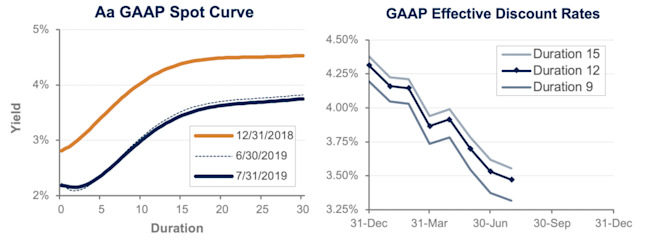 Pension liabilities (for funding, accounting, and de-risking purposes) are driven by market interest rates. The graph on the left compares our Aa GAAP spot yield curve at December 31, 2018, and July 31, 2019, and it also shows the movement in the curve last month. The graph on the right shows our estimate of movements in effective GAAP discount rates for pension obligations of various duration during 2019: