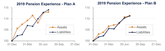 So far in 2019, stock markets have given, and falling interest rates have taken away, leaving pension finance treading water. The graphs below show the progress of assets and liabilities for our two model plans through the first seven months of 2019: