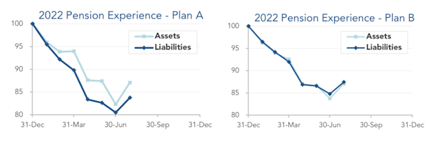 While the first half of 2022 saw falling stocks and rising interest rates, July gave us a sharp reversal: higher stocks and lower interest rates. The net effect has been neutral to modestly positive for most pension plans this year. The graphs below show the movement of assets and liabilities during the first seven months of 2022:
