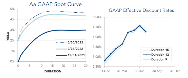 Pension liabilities (for funding, accounting, and de-risking purposes) are driven by market interest rates. The first graph below compares our Aa GAAP spot yield curve at December 31, 2021 and July 31, 2022, and it also shows the movement in the curve last month. The second graph below shows the change in effective GAAP discount rates for pension obligations of various duration so far during 2022: