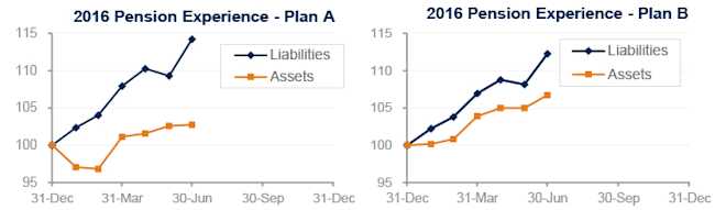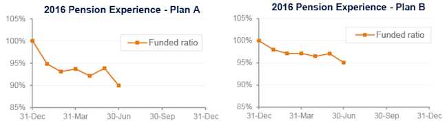 Financial markets have been roiled in the past week by Brexit, adding to pain pension sponsors had already been suffering this year. Both model pension plans we track1 suffered setbacks in June – Plan A lost 4% last month, while Plan B was off 2%. Through the first half of 2016, Plan A is now down 10% and Plan B is down 5%: