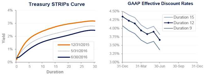 Pension liabilities (for funding, accounting, and de-risking purposes) are now driven by market interest rates. The graph on the left compares Treasury STRIPs yields at December 31, 2015 and June 30, 2016, and also shows the movement in rates last month. The graph on the right shows our estimate of movements in effective GAAP discount rates for pension obligations of various duration during 2016: