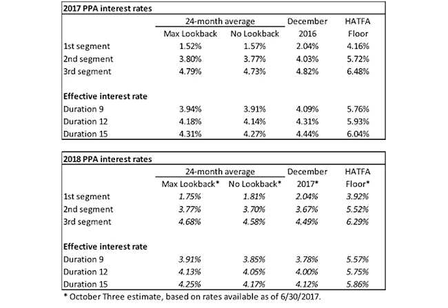 The table below summarizes rates that plan sponsors are required to use for IRS funding purposes for 2017, along with estimates for 2018. Pre-relief, both 24-month averages and December ‘spot’ rates, which are still required for some calculations, such as PBGC premiums, are also included.