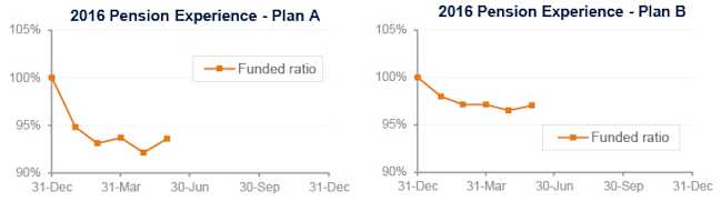Higher interest rates and higher stock prices improved pension finances modestly in May. Both model pension plans we track1 gained a bit of ground last month. Plan A improved 1% in May, but remains down more than 6% so far in 2016, while Plan B picked up less than 1% last month, but is still down 3% year to date: