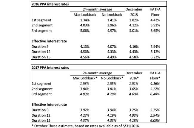 The table below summarizes rates that plan sponsors are required to use for IRS funding purposes for 2016, along with estimates for 2017. Pre-relief, both 24-month averages and December ‘spot’ rates, which are still required for some calculations, such as PBGC premiums, are also included.