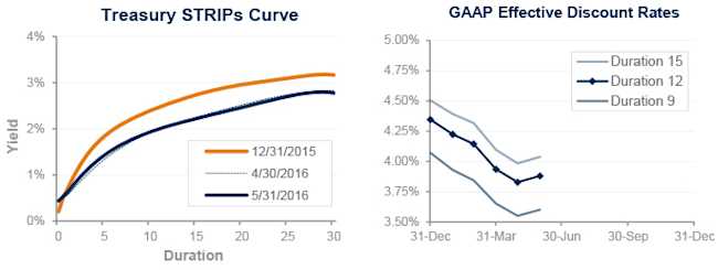 Pension liabilities (for funding, accounting, and de-risking purposes) are now driven by market interest rates. The graph on the left compares Treasury STRIPs yields at December 31, 2015 and May 31, 2016, and also shows the movement in rates last month. The graph on the right shows our estimate of movements in effective GAAP discount rates for pension obligations of various duration during 2016:
