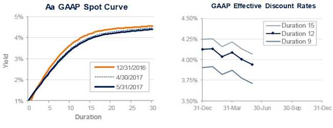 Pension liabilities (for funding, accounting, and de-risking purposes) are now driven by market interest rates. The graph on the left compares our Aa GAAP spot yield curve at December 31, 2016, and May 31, 2017, and also shows the movement in the curve last month. The graph on the right shows our estimate of movements in effective GAAP discount rates for pension obligations of various duration during 2017: