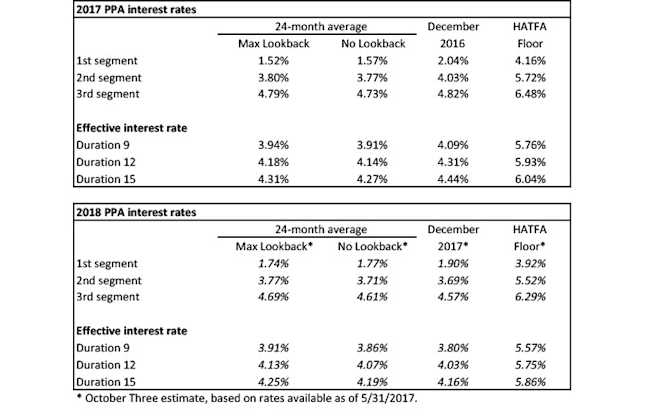 The table below summarizes rates that plan sponsors are required to use for IRS funding purposes for 2017, along with estimates for 2018. Pre-relief, both 24-month averages and December ‘spot’ rates, which are still required for some calculations, such as PBGC premiums, are also included.