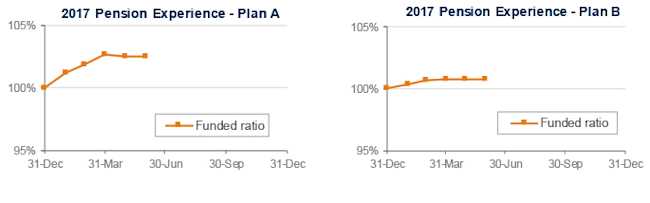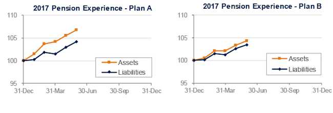 Pension plans managed to tread water last month, with assets and liabilities growing about 1% each during May for both model plans we track1. Through the first five months of 2017, Plan A is ahead 2%-3%, while Plan B is up almost 1%.