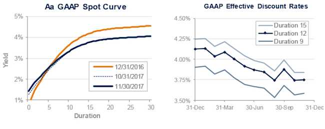 Pension liabilities (for funding, accounting, and de-risking purposes) are now driven by market interest rates. The graph on the left compares our Aa GAAP spot yield curve at December 31, 2016, and November 30, 2017, and it also shows the (small) movement in the curve last month. The graph on the right shows our estimate of movements in effective GAAP discount rates for pension obligations of various durations during 2017: