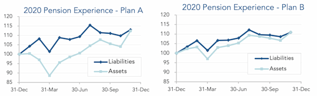 At the beginning of 2020, few people anticipated that interest rates, already at record low levels, would move lower still, or that stock markets, already at record highs, would produce double-digit returns, but here we are. The good news for sponsors is that the stock market rally has effectively closed a “hole” in pension finances that emerged in the first quarter, leaving plans in a position similar to where they began the year. The graphs below show the movement of assets and liabilities for our two model plans during the first eleven months of the year:
