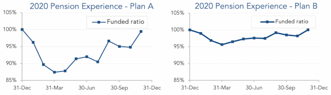 Stocks enjoyed their strongest month of the year in November, propelling pensions toward positive territory for the year. Both model plans we track[1] gained ground last month, with Plan A adding close to 5% and Plan B close to 2% during the month. For the year, Plan A is down less than 1% and Plan B is even through the first eleven months of 2020: