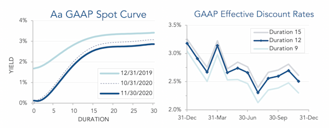 Pension liabilities (for funding, accounting, and de-risking purposes) are driven by market interest rates. The first graph below compares our Aa GAAP spot yield curve at December 31, 2019 and November 30, 2020, and it also shows the decrease in the curve last month. The second graph below shows our estimate of movements in effective GAAP discount rates for pension obligations of various duration during 2020: