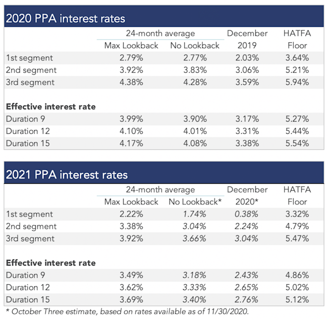 The table below summarizes rates that plan sponsors are required to use for IRS funding purposes for 2020, along with estimates for 2021. Pre-relief, both 24-month averages and December ‘spot’ rates, which are still required for some calculations, such as PBGC premiums, are also included.