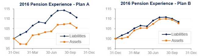 Interest rates remain 0.5% lower than at year-end 2015, so growth in pension liabilities continues to outpace asset growth through the first ten months of 2016.