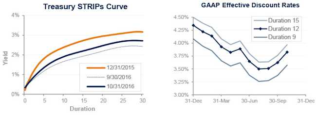 Pension liabilities (for funding, accounting, and de-risking purposes) are now driven by market interest rates. The graph on the left compares Treasury STRIPs yields at December 31, 2015 and October 31, 2016, and also shows the movement in rates last month. The graph on the right shows our estimate of movements in effective GAAP discount rates for pension obligations of various duration during 2016: