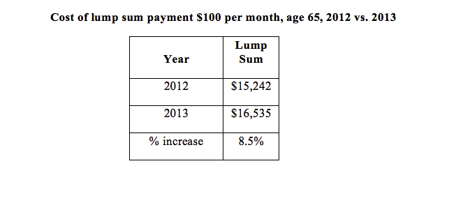 Lower interest rates for 2013 make it more expensive to de-risk (e.g., by paying a lump sum to a terminated vested participant) than last year. Consider below the lump sum value associated with settling an obligation of $100 per month to a 65 year old retiree in 2012 versus 2013.