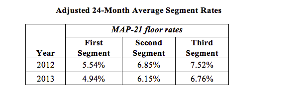 For funding, the determination of the applicable rate is based on averaging interest rates over an historical period – 24 months, with a floor on rates based on a 25-year average under MAP-21 relief. Keeping it simple (we have posted several detailed articles on the MAP-21 rates, including Implications of MAP-21 for DB plan finance), here are floor rates for last year (2012) and this year (2013).