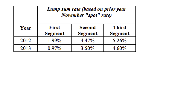 For de-risking, the critical rates are the rates used to calculate lump sums. Generally, those rates are ‘spot’ first, second and third segment rates for a designated month. Many sponsors set the lump sum rate at the beginning of the year, based on prior year November interest rates, so that participants will know what rate will be used to calculate their lump sum for the entire year. Here are lump sum rates for 2012 and 2013 calculated on that basis.