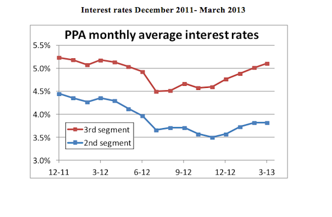 The following chart describes interest rate behavior (based on PPA’s monthly 2nd and 3rd segment rates) from the end of 2011 through March of 2013 (the second segment rate represents the rate in payments in years 5-20, while the third segment rate applies to payments after year 20.)