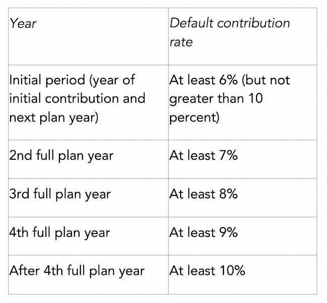 New 401(k) ADP testing safe harbor: It would add a new 401(k) actual deferral percentage (ADP) testing auto-enrollment/escalation safe harbor. To qualify for this safe harbor, the plan would have to default employees into saving at the following rates:
